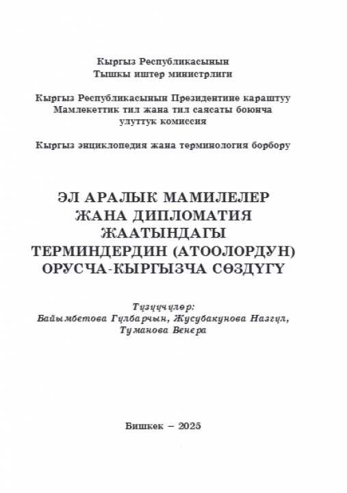 Китепти көчүрүү жана онлайн окуу: ЭЛ АРАЛЫК МАМИЛЕЛЕР ЖАНА ДИПЛОМАТИЯ ЖААТЫНДАГЫ ТЕРМИНДЕРДИН (АТООЛОРДУН) ОРУСЧА-КЫРГЫЗЧА СӨЗДҮГҮ.pdf